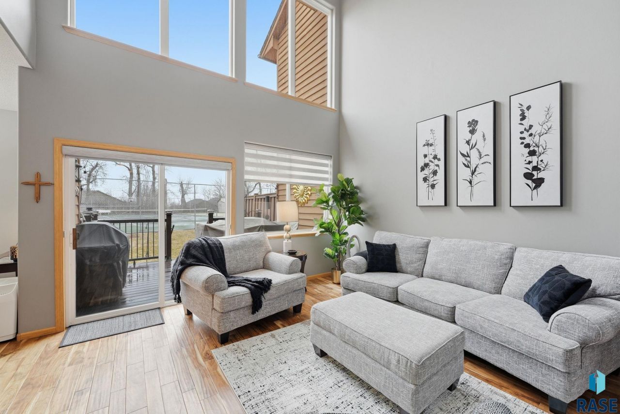 Spacious multi-level condominium offering 3 bedrooms and 3 full bathrooms, with a bathroom conveniently located on each level. This unique layout provides flexibility and impressive architectural features throughout. The lower includes a finished 2 stall garage along with a full living space featuring a kitchen, bedroom, living area, and full bathroom, providing additional living or entertaining space.The main level showcases 19-foot ceilings and a dramatic wall of windows that fill the home with natural light. A floor-to-ceiling fireplace anchors the living room, while the kitchen opens to a dining area and includes an island. This level also features an additional bedroom, full bathroom, and laundry area. The upper level features a private primary suite with a large walk-in closet and an en-suite bathroom offering a whirlpool tub and separate shower. Located on the northeast side of Sioux Falls, this property offers convenient access to shopping, dining, and parks. HOA covers lawn care, snow removal, trash, water, sewer, exterior maintenance, and exterior insurance, providing low-maintenance living.