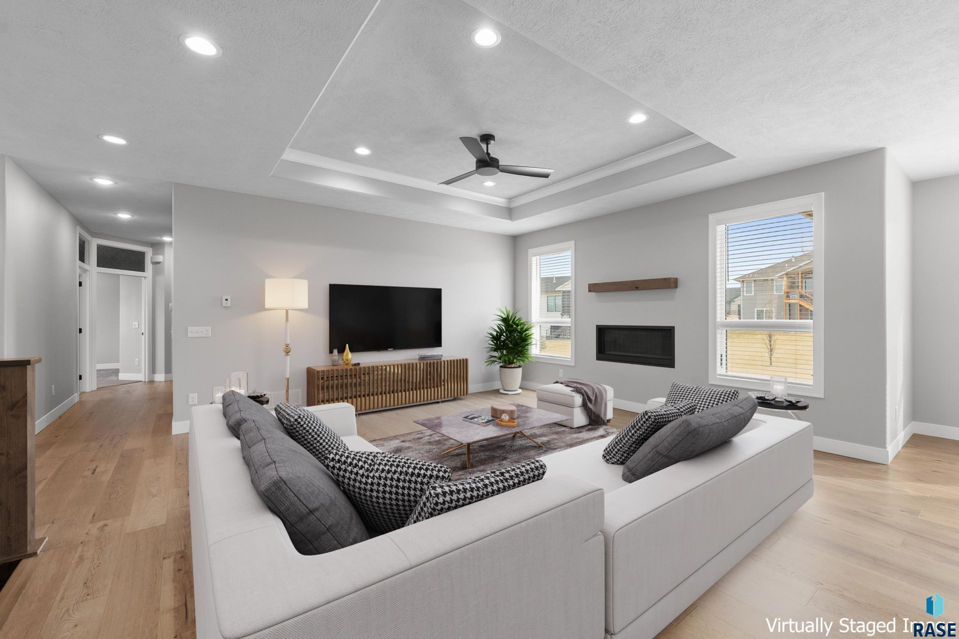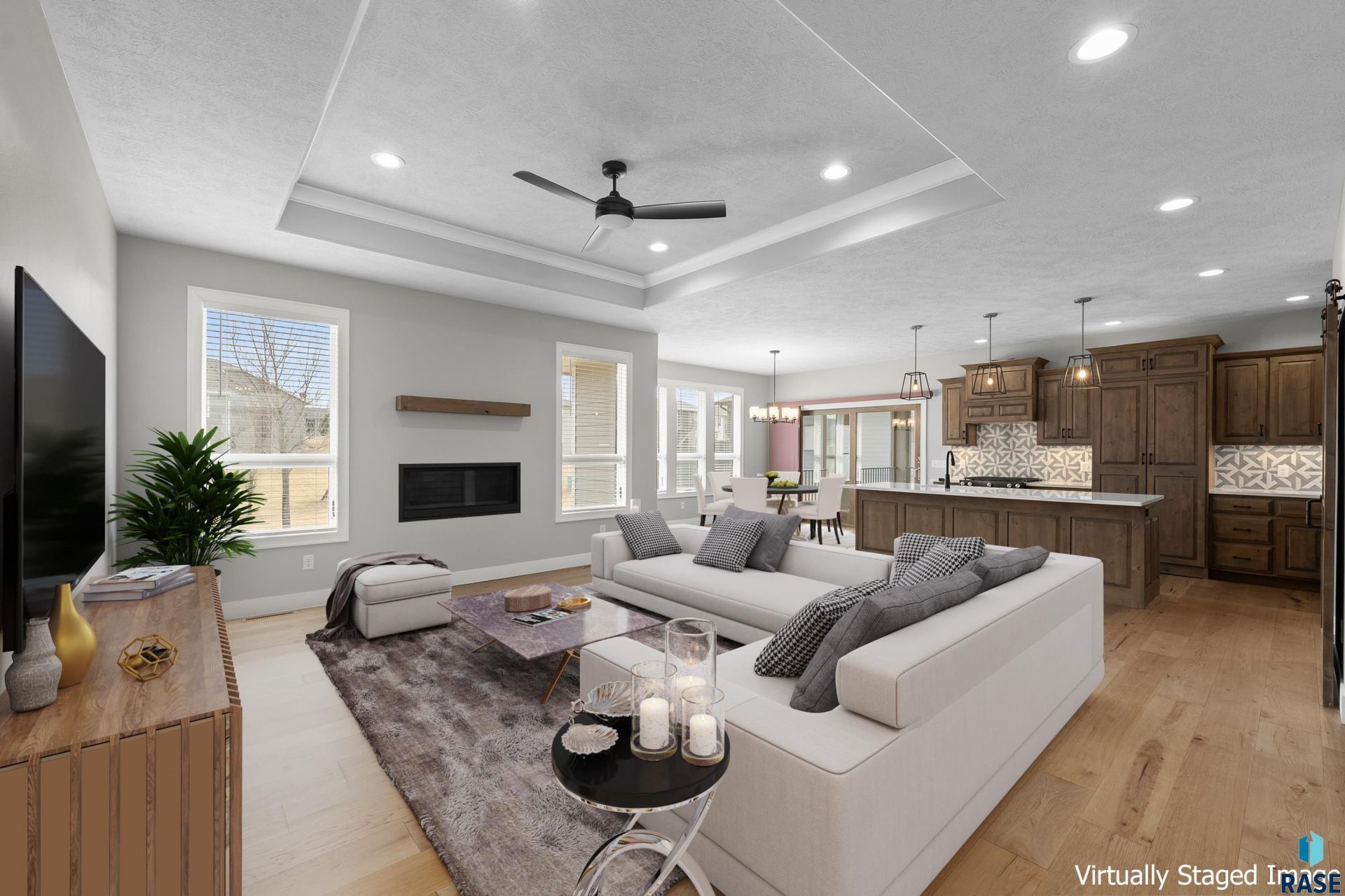 Immaculate zero entry ranch offers spacious open living concept on main floor and is enhanced with chef's kitchen and eating area with glass doors to screened porch. A luxurious owner's ensuite with walk-in closet and private bath, complete with heated floor, walk-in tiled shower, and twin sink vanity. Experience easy living in this beautifully crafted home featuring engineered wood flooring, tray ceiling, and modern linear gas fireplace. The chef-inspired kitchen showcases a large island, Cambria quartz countertops, under-cabinet lighting, and hidden walk-in pantry. The screened porch and spacious backyard are perfect for relaxing or entertaining. The lower-level family room has a gas fireplace, wet bar, and in-floor heat. The lower level has 2 bedrooms, a full bath, and 2 storage rooms. The oversized 4 car garage (1,158 square foot) features an epoxy floor, hot and cold-water hook ups, floor drain, diesel heater, and Cat-6 internet connectivity. A total of 5 bedrooms (3 on the main level), 4 baths, and over 3,500 square feet of upscale finishes are completed with practical design throughout. Excellent condition! Some photos are virtually staged.