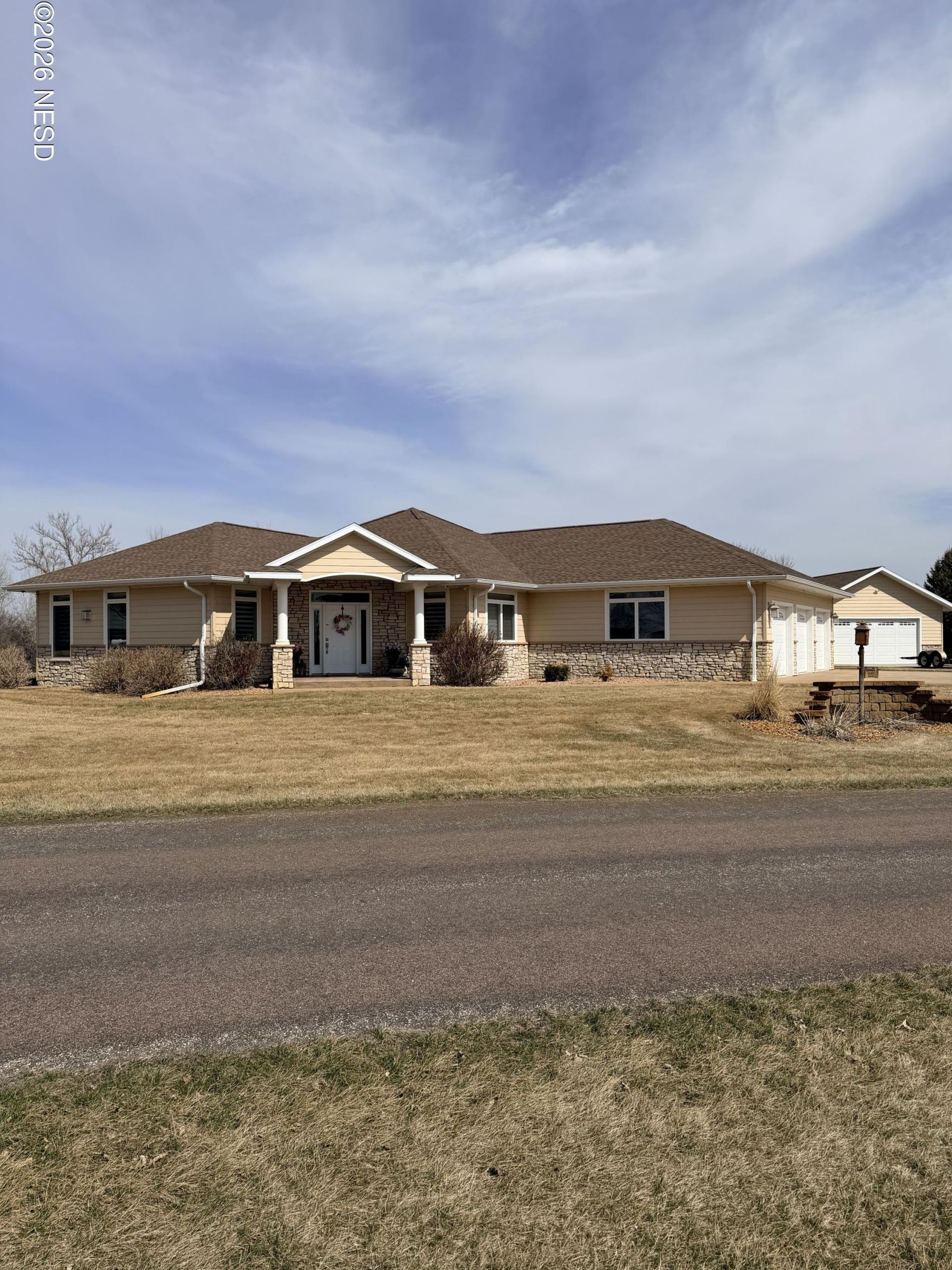 This property has a 4 bedroom, plus den, 3 bathroom home located on the golf course 2 miles North of Milbank on Hwy 15. Built in 2011, the main level has 9' ceilings. It has in-floor heat on both levels as well as the 3 stall attached garage and the 24x32 detached garage. It is wired for a generator as well. There are many upgrades to the property including custom cabinets, hidden walk-in pantry, instant water heater (in addition to a Rheem Marathon water heater), lawn irrigation system, a laundry room on each level, double oven, gas cooktop, granite countertops, reverse osmosis, & stainless steel appliances. Cosmetically updated in 2023 as well as new shingles on house and outbuildings. In addition to the shop, there is a garden/golf cart shed in the backyard. If you are looking for a comfortable home at an affordable price, don't miss out on this opportunity.