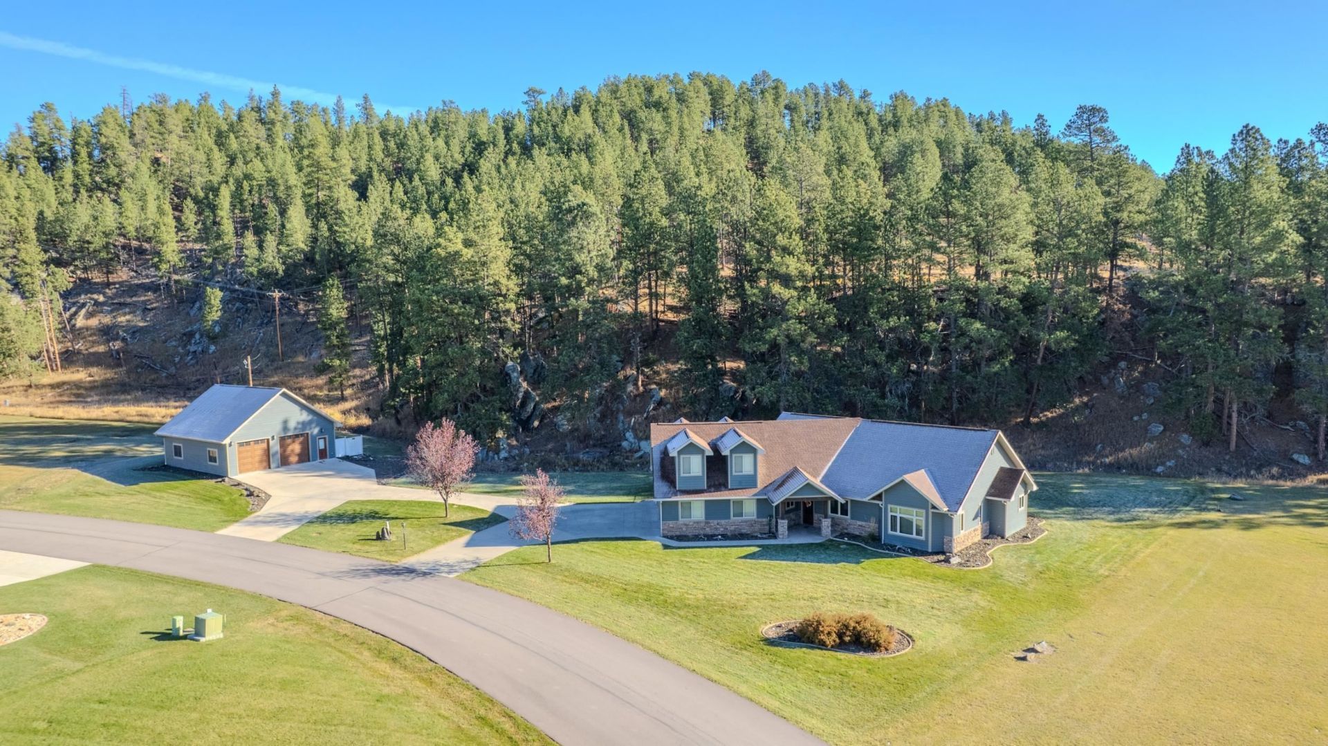 RARE BLACK HILL HIDDEN TREASURE! Wonderful Hill City Location! ABSOLUTE SPLENDOR FROM TOP TO BOTTOM! Glimmering open-concept 1.5 story bursting with curb appeal in a serene setting on just under an acre with great Hills & lake views, a thick pine tree backdrop, and touching miles upon miles of USFS lands! Chef's delight eat-in kitchen showcases a 2-tiered center island, heaps of granite countertops, rows of custom cabinets, stainless steel appliances, 2 walkouts accessing the patio & backyard, plus striking luxury vinyl tile flooring with electric hydro in-floor heating extending into an ample formal dining room area & great living room with cozy stone-encased gas fireplace & vaulted ceiling. Luxurious main floor master suite with brand new carpet and a private bathroom highlighting a double vanity, whirlpool tub, and walk-in tile shower. Expansive main floor hosts a good-sized guest bedroom, 2nd full bathroom, and convenient laundry with stackable washer & dryer that stay. Upper level holds an ample 3rd bedroom, 3rd bathroom, and mini split system. Lovely back patio with pergola and built-in counter with grill. 32x24 2-stall attached garage with small fenced-in area behind it plus a 34x34 2-stall detached garage built in 2017 with dry bar area and substantial loft, for a generous amount of storage options! Schedule your tour today! Adjacent 0.34 acre lot available for purchase.