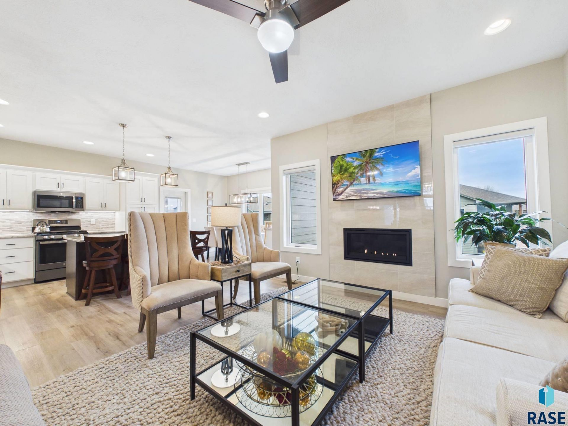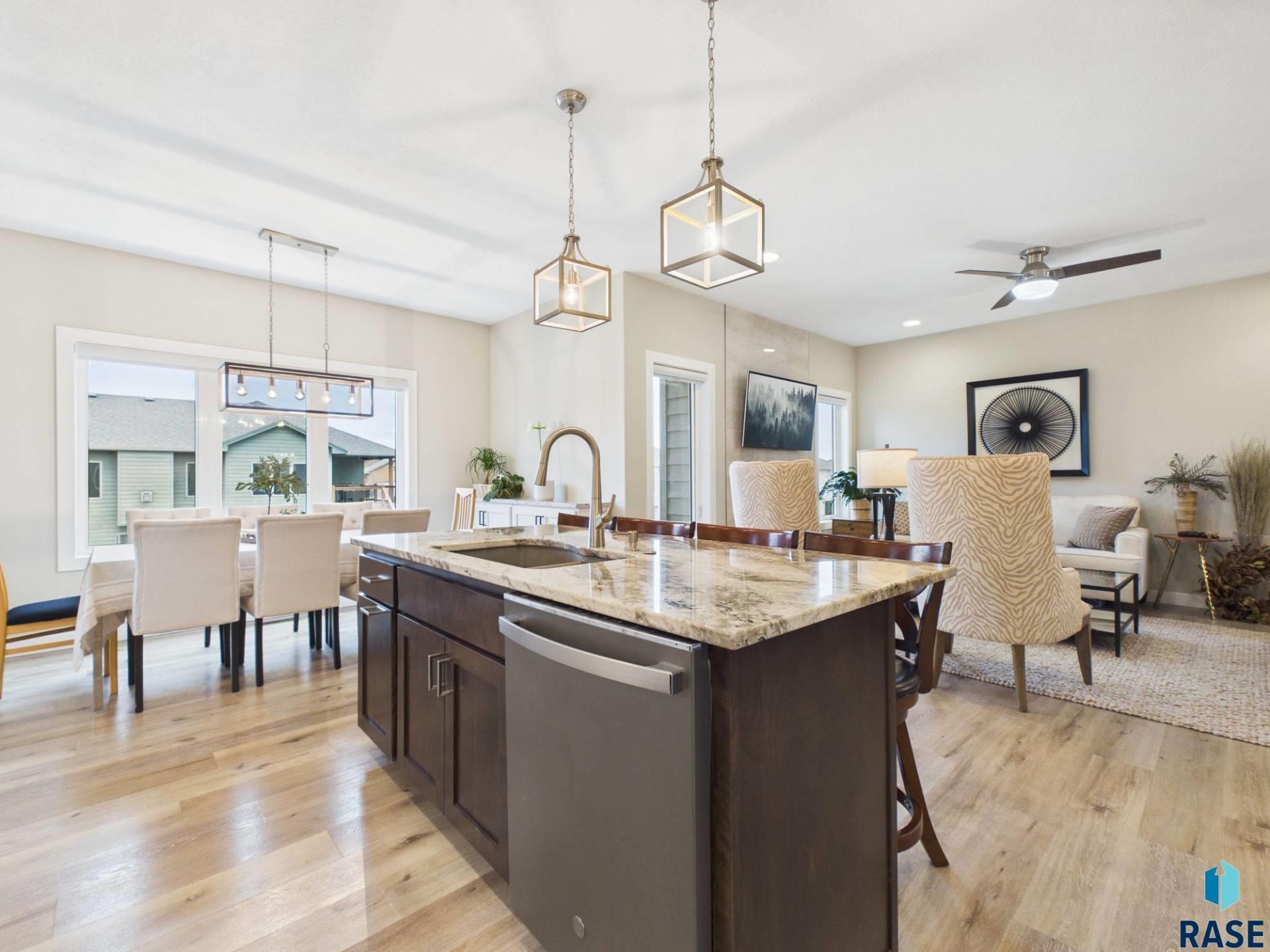 Stunning ranch walkout located on a quiet cul-de-sac featuring 5 bedrooms (3 on the main) and 3 bathrooms. Step inside to an open, spacious living, kitchen, and dining area highlighted by gorgeous LVP flooring throughout. The kitchen showcases custom cabinetry by Dakota Kitchen & Bath featuring extra shelves, to provide ample storage, quartz and granite countertops, black stainless-steel appliances, a beautiful, tiled backsplash, and a large island perfect for entertaining. The dining area offers ample space for large gatherings and flows seamlessly to screened-in deck - with a TV hookup ideal for enjoying summer movie nights. Cozy up in the living room beside the inviting gas fireplace. The primary suite features a private bath with a tiled shower, dual sinks, and a walk-in closet. Convenient main-floor laundry is located just outside the primary suite. Two additional bedrooms or office spaces complete the main level. The lower level offers a spacious family room with plenty of room for a pool table or recreation area, along with a stunning wet bar featuring a tiled backsplash and oversized island designed for gathering. Two additional large bedrooms, a finished storage room, and walkout access to the patio provide the perfect setup for entertaining and outdoor lawn games. Oversized 3-stall heated garage w/ epoxy flooring, water hookups/drains and window treatments from Montgomery furniture completes this exceptional home.