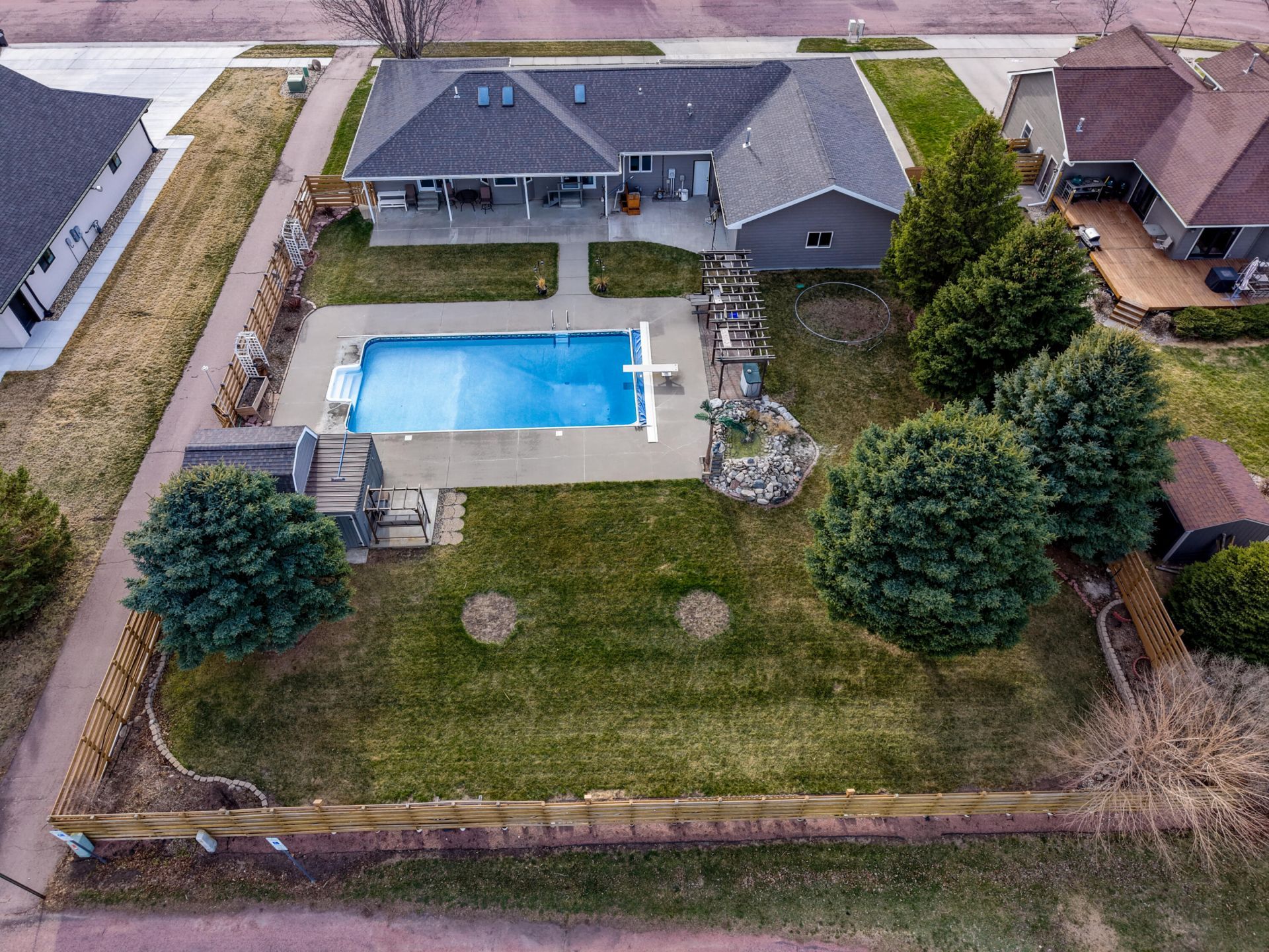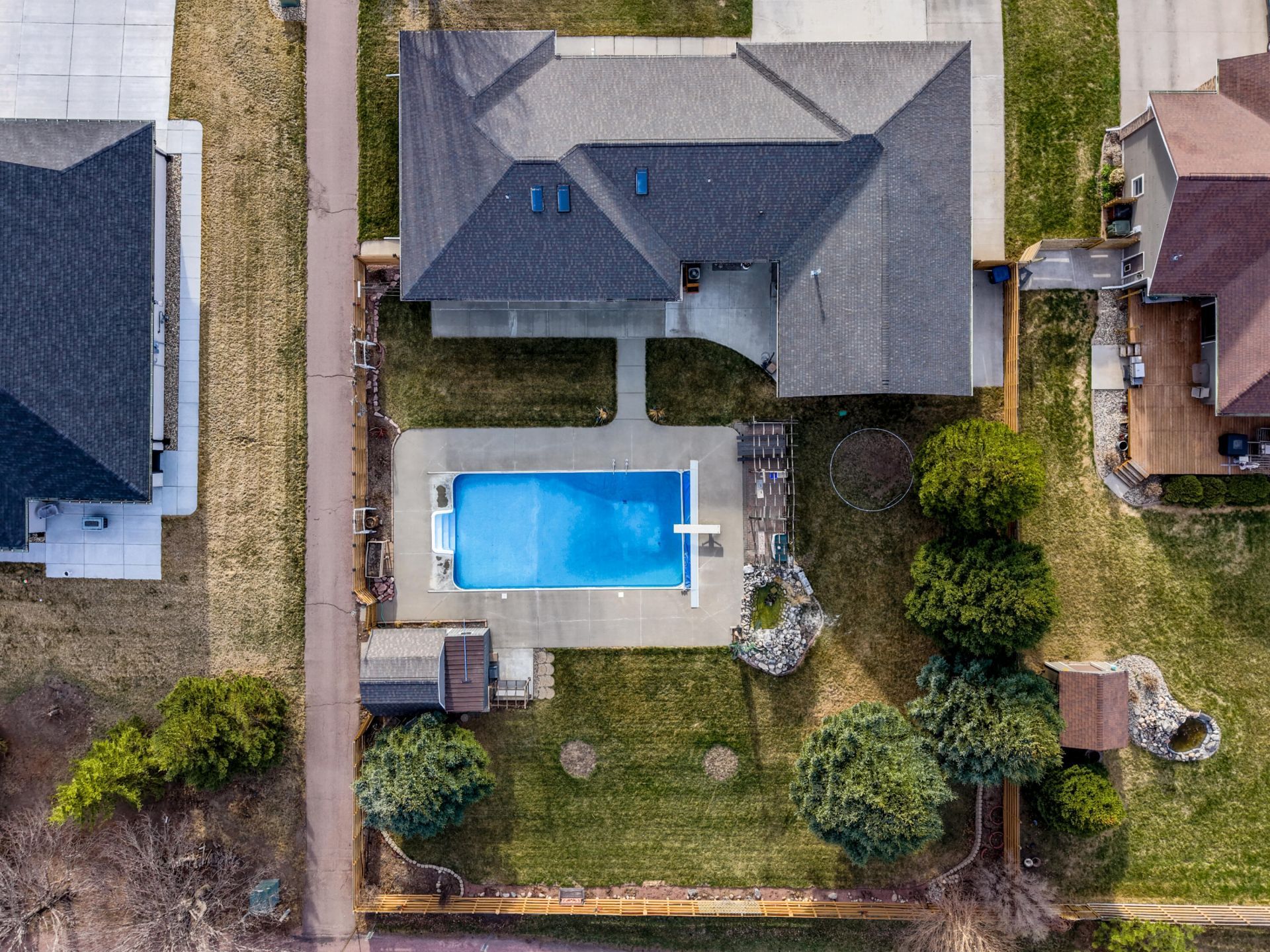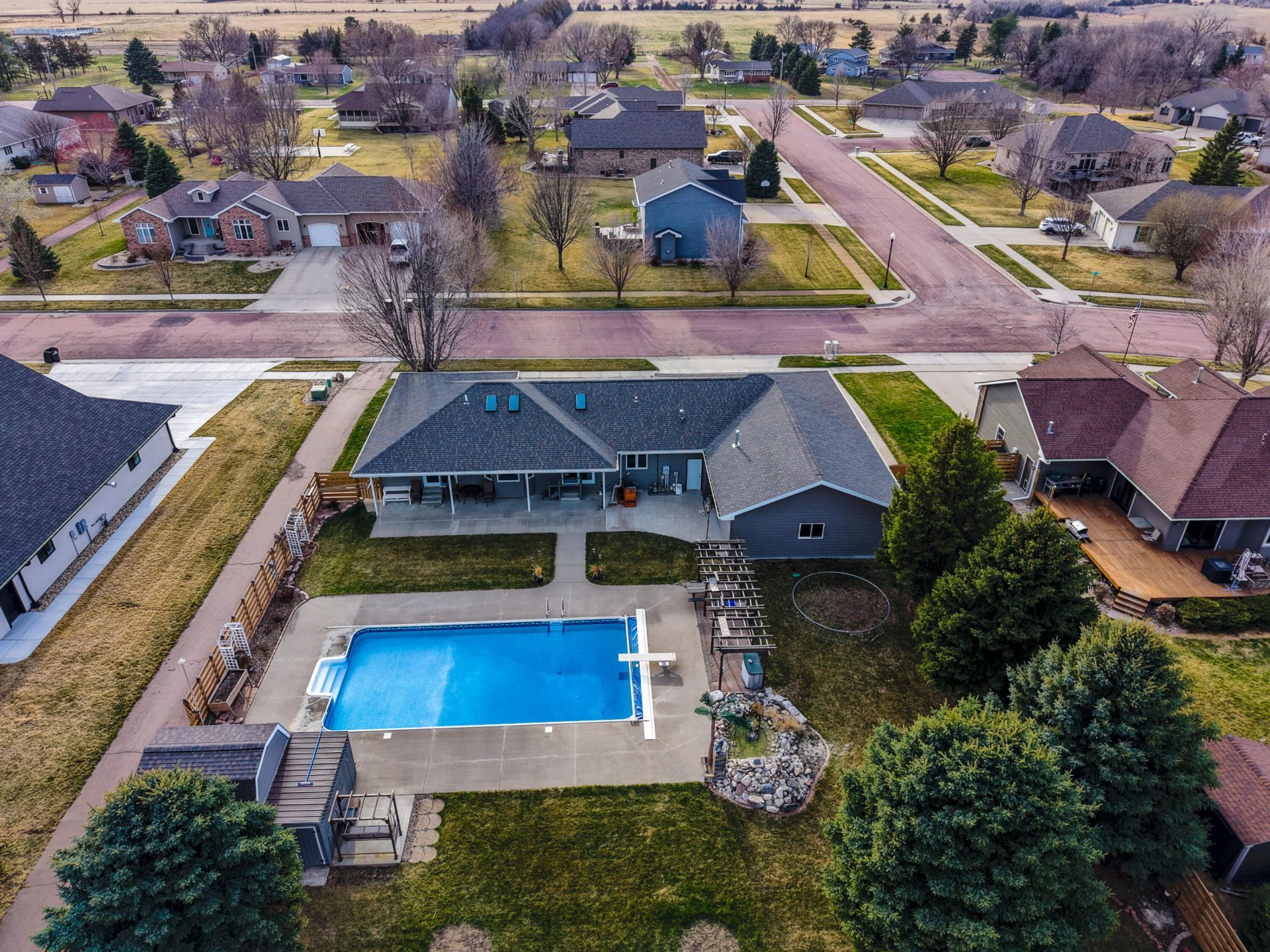 Get ready for summer entertaining with this spectacular outdoor paradise! Each room on the main floor of this beautifully updated 4-bedroom, 2.5-bathroom home has been thoughtfully renovated with stylish finishes throughout. The inviting living room features a gas fireplace with hearth and a surround that extends all the way to the vaulted ceiling. Three skylights, a patio door, and a charming bay window fill the space with abundant natural light and create an open, airy feel. The spacious master suite includes its own patio door leading to the backyard retreat. The master bathroom is full of character with its farmhouse-inspired design, relaxing soaker tub, and walk-in shower. The kitchen opens seamlessly to the living room and showcases a large solid-surface island with a gas range, built-in oven and microwave, and generous storage space--perfect for everyday living and entertaining. Additional highlights include main floor laundry, a smart thermostat, and updated woodwork with 3-panel doors throughout the main level. An open staircase leads to the basement, where you'll find a large family room, a full kitchen in the lower level, a full bath with tub/shower combo, and two spacious bedrooms with egress windows. This quality home was built by Mueller Lumber. The heated and insulated 3-stall garage features an additional rear addition for two more vehicles, plus a versatile flex room. There's also an extra-deep parking pad to the north of the home--ideal for your RV, camper, or boat. The crown jewel of the property is this well-designed backyard oasis, complete with a heated 20' x 40', 9-foot-deep swimming pool with divin