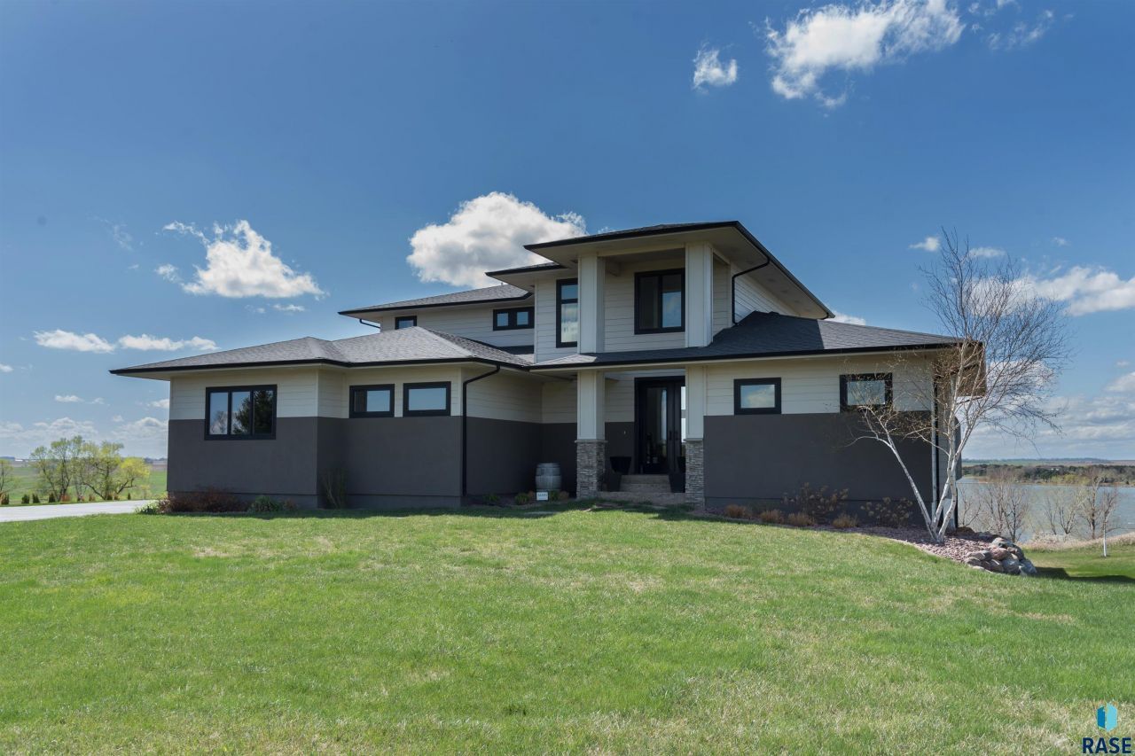 This stunning contemporary home sits on Lake Vermillion and delivers a perfect sanctuary from a chaotic world. Only 25 minutes from Sioux Falls, offers year-round retreat with breathtaking views; letting the great outdoors greet you from every level. Family-friendly, five-bedroom, four-bath, 4,113 square foot 2-story walk-out dwelling is designed for both daily living and entertaining. Gracious entrance and sundrenched great room is enhanced with variegated-high-polished Italian marble flooring, two-story floor-to-ceiling windows, and trendy fireplace. Custom kitchen with center island is open to the living area and a spacious dining area with glass doors to deck and view of the lake. Main floor owner's suite has two exceptional walk-in closets and full bath complete with soaking tub, tiled shower, and double sink vanity. Upper level has two bedrooms, one with access to deck, full bath, and loft area for study or sitting. Lower level is perfect for entertaining with 2 bedrooms, full bath, and a family room with fireplace that opens to the party room with wet bar and gaming areas. Door to patio and firepit. The 3 car garage doubles as a man-cave plus a parking pad for extra vehicles. Back foyer has entry to garage, the handy laundry/mud room is adjacent. Perfect condition with nothing to do here but move in! Nestled on over an acre of solitude and located on the eastside of the Lake adjacent to Lake Vermillion Recreational Area, which provides an abundance of outdoor adventures. From camping spots and peaceful fishing areas to scenic biking and hiking trails and canoe/kayak/paddleboard rentals, there's something for everyone to enjoy!