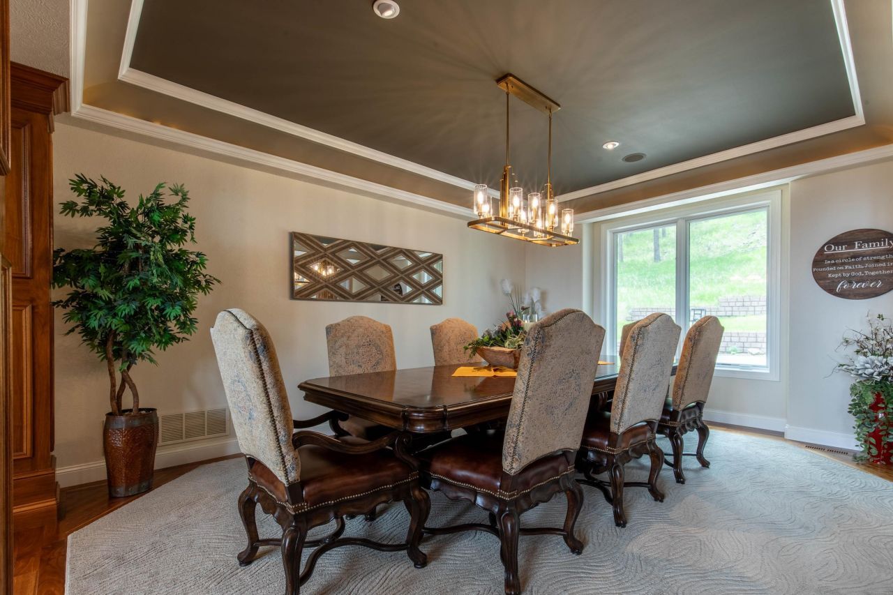 Listed by TJ Wojtanowicz - Black Hills Realty - 605-863-1920. Gorgeous custom-built home on 3 acres with amazing city views. Incredible & unique property boasts 7000+ square feet, yet provides an inviting & welcoming feel. Beautiful woodwork & built-ins, hardwood floors & stunning custom windows. The main level offers a grand entry with/ breathtaking views in the living room w/fireplace, formal dining area, & office. The chef's kitchen w/ additional dining area, sitting room w/fireplace & separate walk-in pantry. A relaxing master en-suite with huge sliding patio doors out to the back deck. The master bathroom is an oasis to enjoy the soaking tub or gorgeous tiled walk-through shower. A full laundry room w/cabinet storage completes this floor. On the lower level, there's no lack of space for entertaining or storage. A spacious living room w/full bar, half bath & walkout to the large concrete patio. Three large bedrooms, each w/ their own full bathroom & walk-in closet. Plus, additional laundry room & large bonus room. Also, huge heated 3 car garage!