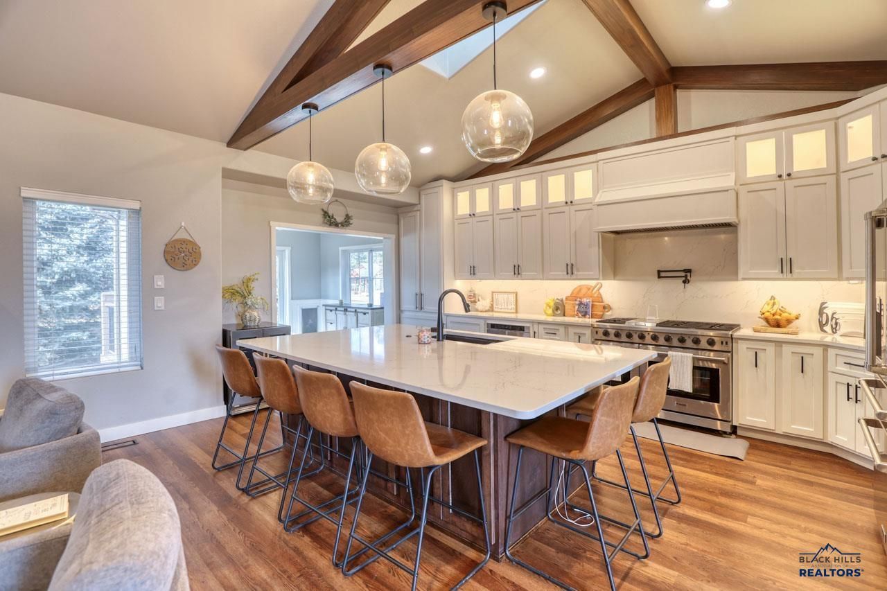 This amazing home is a true Gem of the Black Hills. Nestled in the peaceful and serene setting in Canyon Springs Preserve. Extensive professional upgrades make this a remarkable home that even Gordan Ramsey would envy. The kitchen features custom maple and oak white cabinets with upper and under cabinet LED lighting, the pull outs and details inside the cabinets leave no detail unturned. Commercial Thor appliances, built-in microwave drawer, pot filler, built-in pull-outs and even step stools for those high places. 6'x8' custom island with charger ports and outlets. The crisp look of the Cambria Quartz counters and backsplash enhance the entire space. The open spaces, wooden beams, composite 80% slate flooring, gas fireplace, solar powered skylights with remote shades, ambient lighting showcase this space. Dining room area with double Pella doors leading to your back entertaining space, main floor office, separated master suite along with elegant undated master bath. Office could be used for a 5th or guest room (no closet). New interior doors. Seller is related to listing agent.