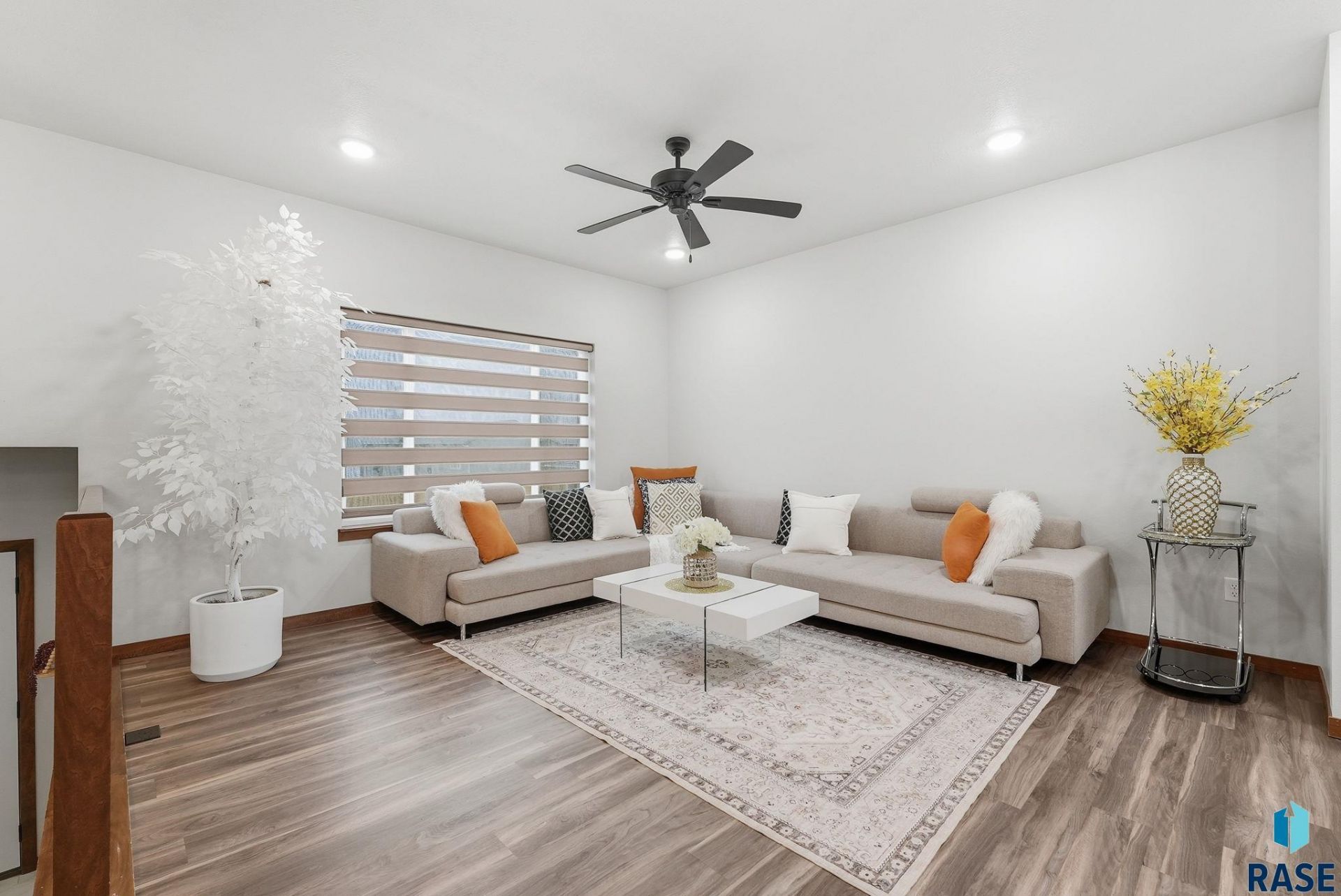 Spacious 4 bedroom, 3 bathroom home with a 3-stall garage and an open living, kitchen, and dining layout. The kitchen features an island, white cabinets, and a slider leading to the deck. LVP flooring runs through the main living, kitchen, and dining areas. The main level includes two bedrooms and two bathrooms, including a primary suite with a private bath and walk-in closet. The basement offers a large living room with LVP flooring, two additional bedrooms, a full bathroom, and a finished independent laundry room. The finished garage includes cabinets that offer potential for a secondary kitchen setup.