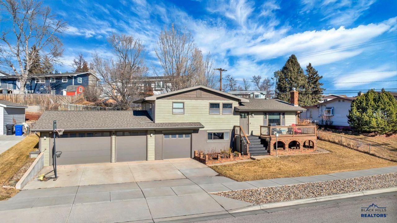 This beautiful west-side home has been completely remodeled from top to bottom within the past three years. While thoughtfully designed within its footprint, the layout feels spacious and functional, offering three bedrooms on the upper level, two generous living areas, an additional bedroom on the lower level, and an impressive 4-car garage. Not enough living space? No problem, turn the 253 sq ft., fully insulated, separate 1-car garage that's closest to the house into a work-out room, man cave, she shed, or whatever you can dream up! The main-level great room features vaulted ceilings with an accent beam, new hardwood flooring in the living area, and durable LVT flooring in the kitchen and dining spaces. The kitchen is a standout with high-end black stainless steel appliances, including a five-burner gas range, soft-close cabinetry with above-cabinet lighting, granite countertops, and a center island that comfortably seats three to four. Upstairs, hardwood floors and solid six-panel doors run throughout. The bathroom is finished with Adura tile flooring, double sinks, marble countertops, and a custom built-in vanity for additional storage. The lower level offers a fantastic mudroom entry from the three-car garage, complete with washer and dryer, a ¾ bathroom featuring a light-up mirror and tiled floor, and an additional bedroom with a daylight window. From there, the home opens into the basement family room with a tray ceiling and new carpet. An 11' x 19' storage room includes built-in shelving, a sump pit, water softener, and gas furnace. Outside, the fully fenced backyard is accessible from the dining room and showcases a covered patio with a lighted awning, leading to a flat, grassy area with an in-ground sprinkler system, all surrounded by mature landscaping.