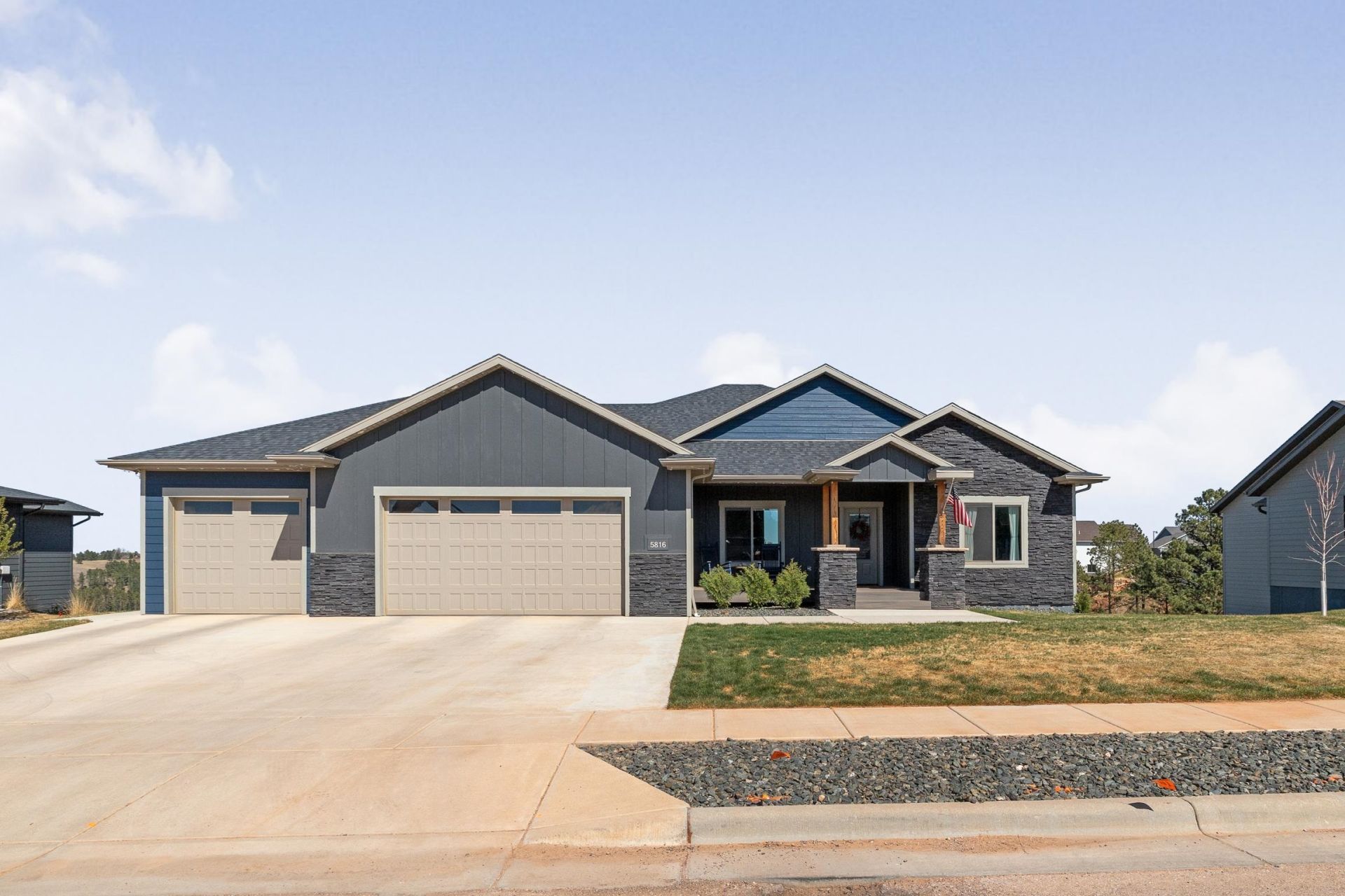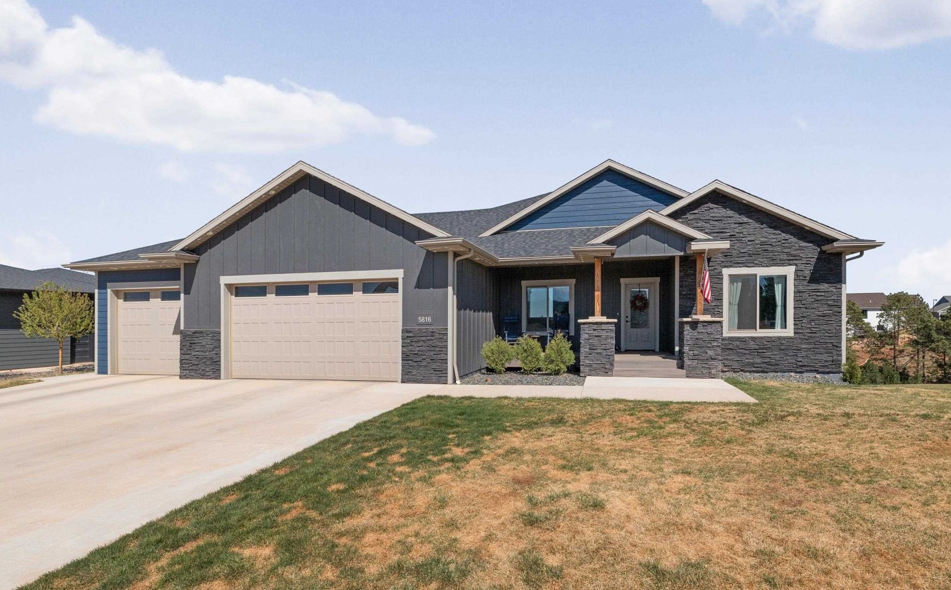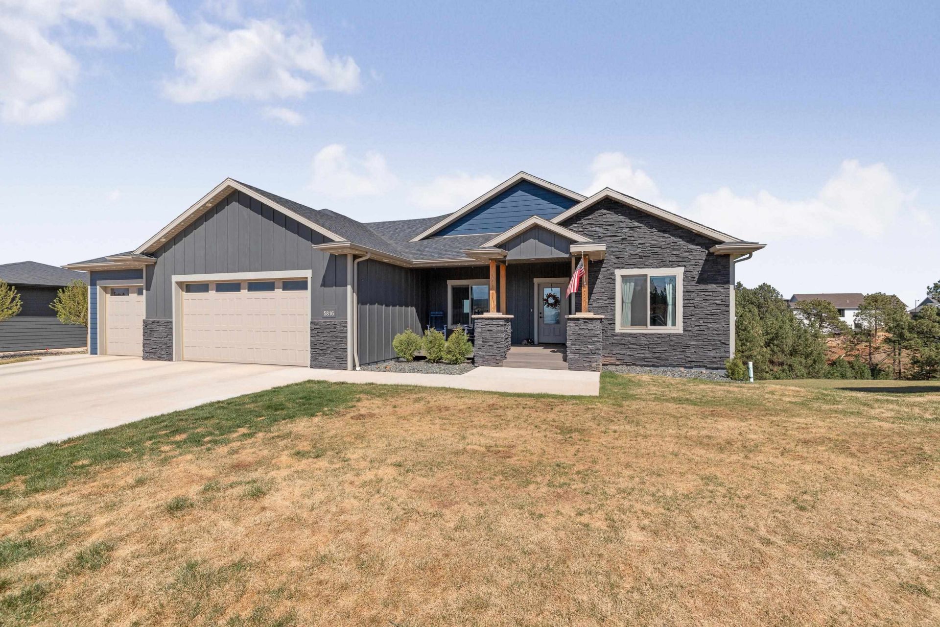 Listed by Marisa Wollman, Oak & Key Realty, 605-230-0016. Welcome to this exceptional custom-built ranch-style home in the highly sought-after Highpointe Ranch in southwest Rapid City, minutes from Red Rocks Golf Course. Featuring 5 bedrooms, 3 bathrooms, and an impressive 4-car garage, the home showcases an open-concept design with breathtaking 180-degree views from the dining room and expansive windows which carry into the family room, anchored by a stunning 12' high stone gas fireplace. The kitchen is beautifully finished with stainless steel appliances, quartz surfaces throughout and under-cabinet lighting?ideal for everyday living and entertaining. Thoughtful craftsmanship is evident throughout, with abundant storage including an expansive laundry and mud room, large walk-in closets, extensive cabinetry with quartz surfaces, and built-ins. The primary suite offers private access to the covered deck, along with a spacious walk-in closet and a luxurious bath featuring dual vanities, a soaker tub, and a custom tile shower. The walkout basement includes oversized bedrooms and versatile spaces perfect for a theater room, hobbies, gatherings, or exercising. Enjoy outdoor living with a covered deck above and a private patio with hot tub below. The oversized garage easily accommodates a boat and three additional large vehicles.