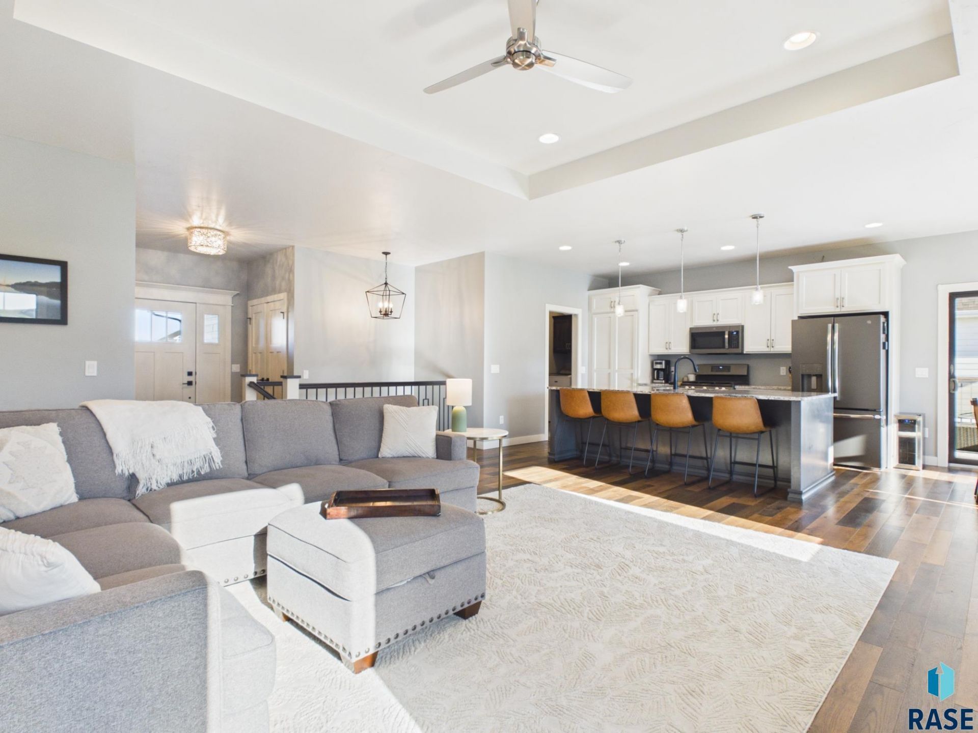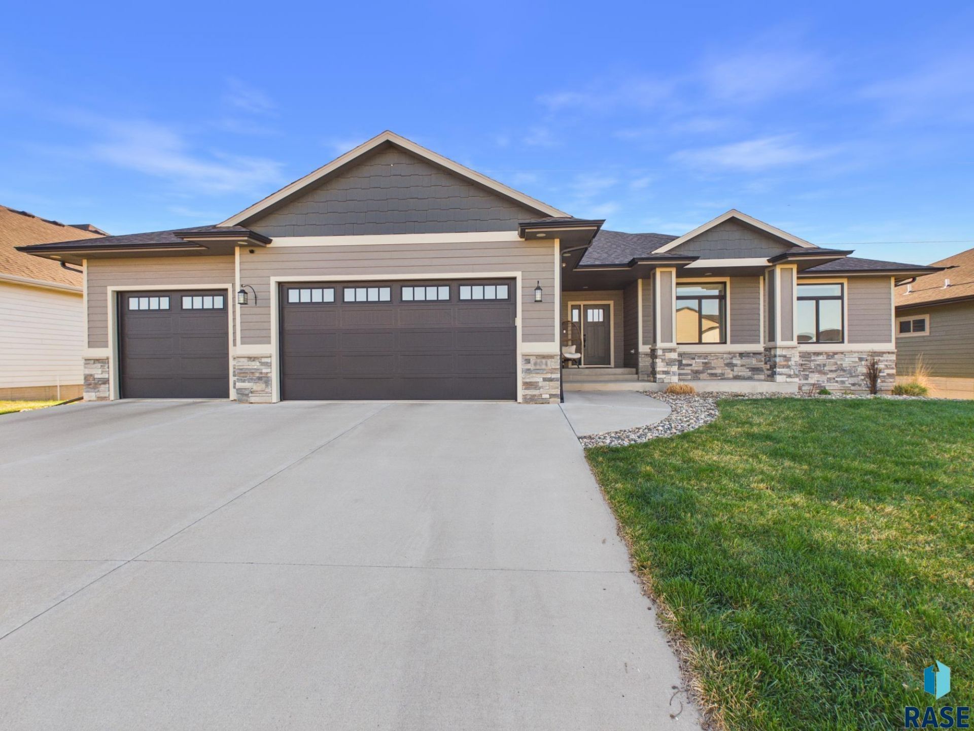 Welcome to this well-crafted 5-bedroom, 3-bath ranch-style walkout home located in the desirable Willow Ridge area. Built in 2019 and meticulously maintained, this spacious residence offers over 3,000 square feet of finished living space on a generous lot. Step inside to an inviting open-concept main level featuring wood flooring, a cozy gas fireplace, and a living room that flows seamlessly into the kitchen and dining area. The kitchen boasts a large granite island, hidden walk-in pantry, and modern appliances. Enjoy meals in the dining area with a slider leading to a large covered deck-perfect for entertaining or relaxing outdoors. The main level includes three bedrooms, highlighted by an inviting owner's suite with dual sinks, a tiled shower, and a spacious walk-in closet. Two additional bedrooms on this level offer double closets and flexibility for a home office. Main floor laundry adds convenience. The finished walkout basement provides a large family room with a second gas fireplace, wet bar, and access to the patio. Two more bedrooms and a full bath complete the lower level, making it ideal for guests or a growing family. Additional features include: 3-car oversized heated garage with drain and water hookups, tray ceilings and 9 ft+ ceilings in the lower level, covered front porch and professional landscaping with underground sprinklers, located in the Brandon Valley School District (Fred Assam ES, Brandon Valley MS & HS). Conveniently situated near parks, schools, and major roadways, this home combines comfort, style, and functionality.