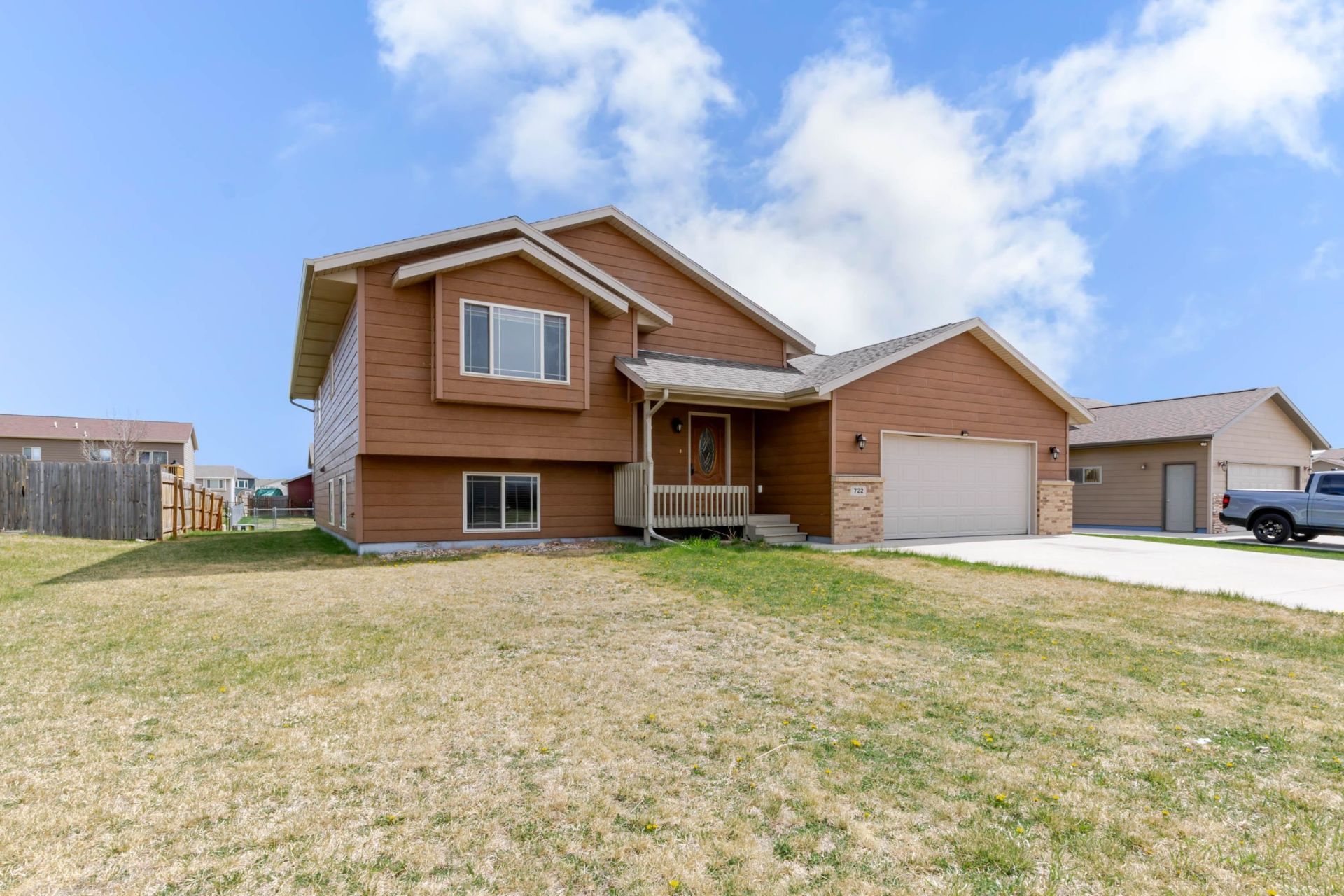 Listed by TJ Wojtanowicz at Black Hills Realty 605-863-1920. Welcome to 722 Radial Lane in Box Elder?a spacious split foyer home on a large interior lot, ready for new owners! Offering 4 bedrooms, 3 bathrooms, and over 2,300 sq ft, this home provides space and flexibility for a variety of lifestyles. The open-concept main level features a bright living room that flows seamlessly into the kitchen and dining area with vaulted ceilings, neutral paint, and abundant natural light throughout. The corner kitchen offers ample cabinetry, generous counter space, and an island for added storage and seating, while the dining area provides plenty of room for gatherings. The upper level includes a primary suite with a walk-in closet and private en suite bath, along with one additional bedroom and a full bathroom. The lower level boasts an oversized family room, two additional bedrooms with large windows, a full bath, and a sizable laundry/mechanical room with extra storage. Additional highlights include an attached 2-car garage with side yard access, a large flat yard partially fenced on two sides, and a raised deck overlooking the backyard?perfect for relaxing or entertaining. Conveniently located near Douglas schools and just minutes from Ellsworth Air Force Base.