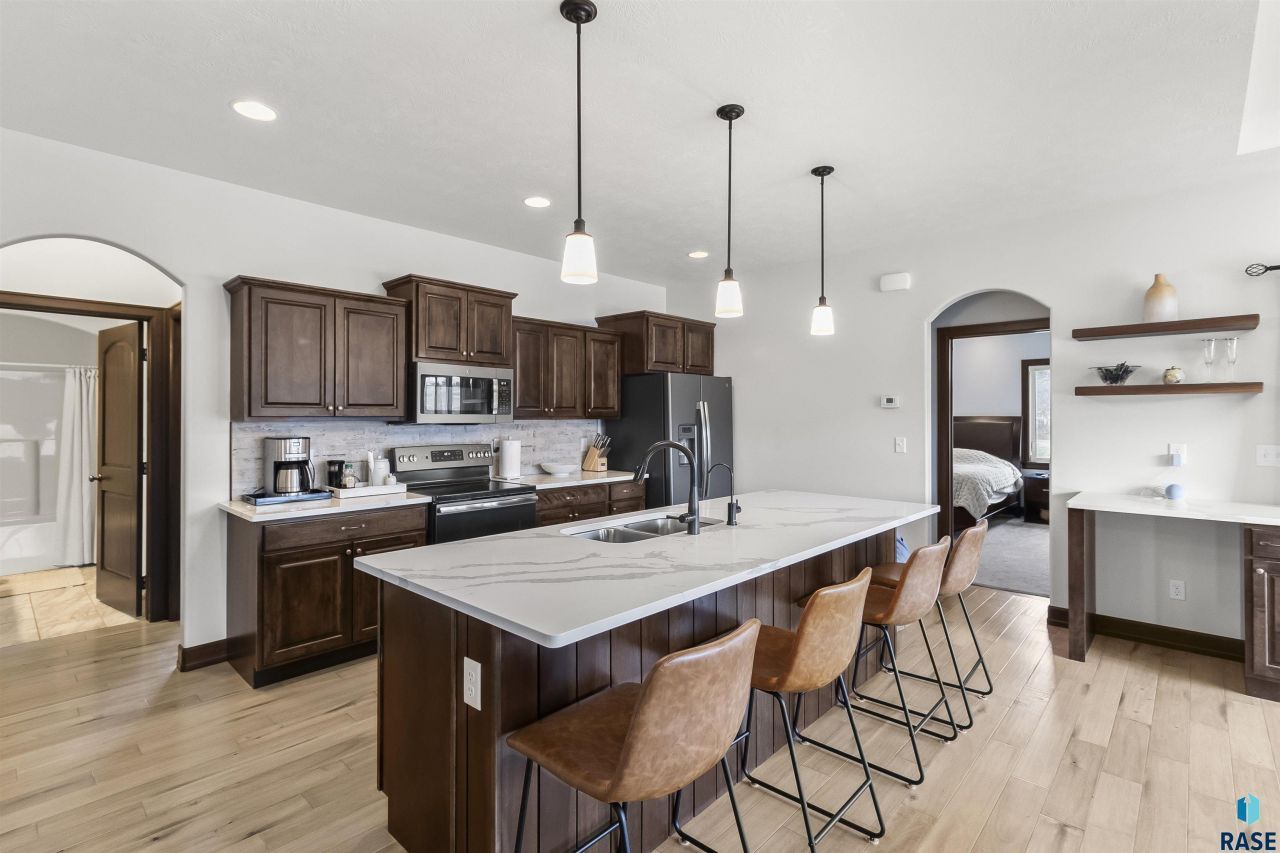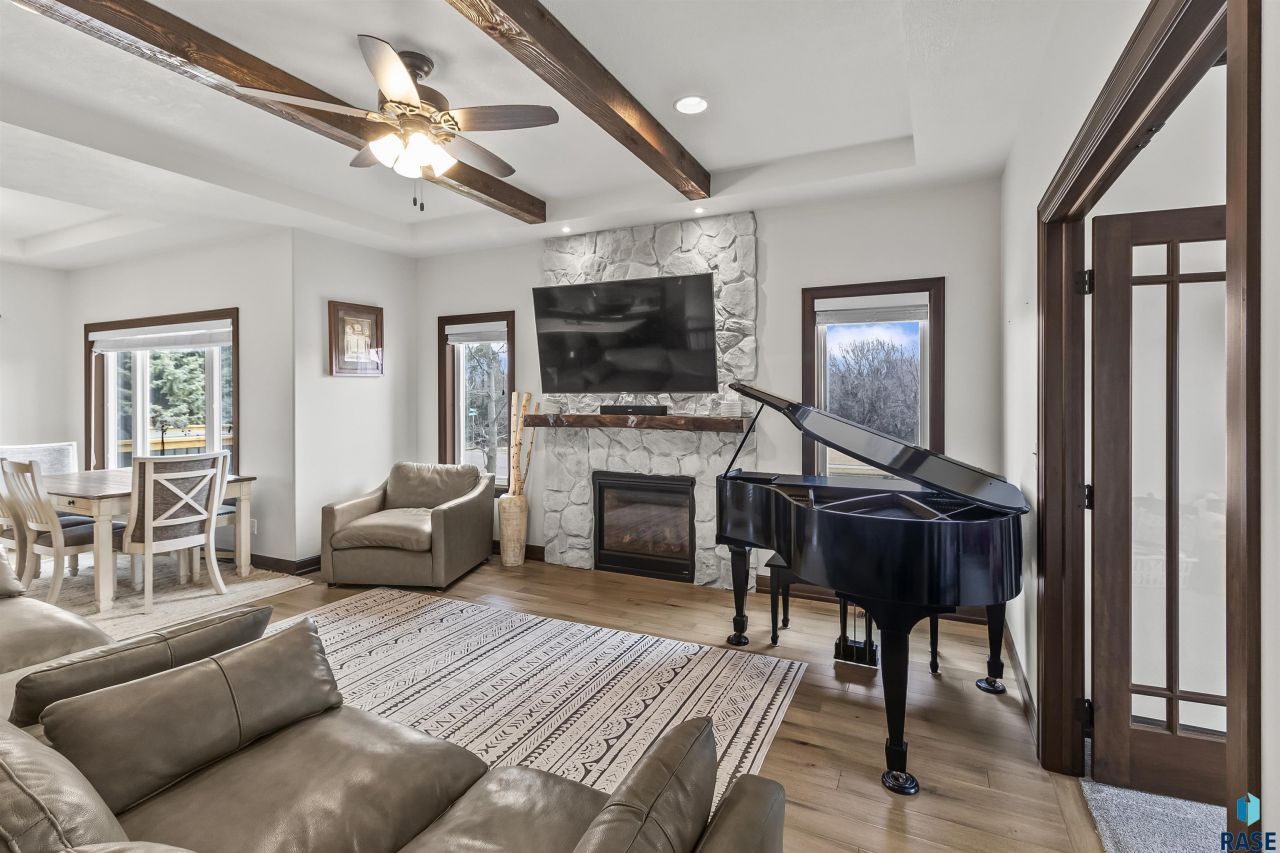 Welcome to this exceptional east Sioux Falls home offering 0ver3200 square feet of thoughtfully designed living space, perfectly situated on more than half an acre with no backyard neighbors for added privacy and serene views. This 4 bedroom, three bath home features a highly desirable layout, including a main level den/office-ideal for remote work or a quiet retreat. The open-concept living area is anchored by a cozy gas fireplace and filled with natural light, creating a warm and inviting atmosphere for both everyday living and entertaining. The kitchen is both stylish and functional featuring quartz countertops, ample cabinetry and a spacious walk-in pantry with storage on both sides- perfect for organization and everyday convenience. It flows seamlessly into the dining and living areas, making it ideal for hosting and gathering. The fully finished lower level expands your living space with a wet bar and generous room for gatherings. The 4-stall garage comes complete with an outlet for electric vehicles. The HOA amenities include a clubhouse, fitness center, pool, basketball and tennis courts, batting cage and playground. There is also a private river access. Quiet, no through traffic, neighborhood makes this a highly sought-after area. This top rated school district offers a Blue Ribbon elementary school nearby. Don't miss out on this rare opportunity to own a premier property in the desirable 57110 area.