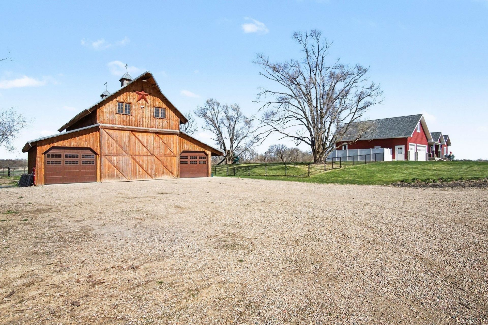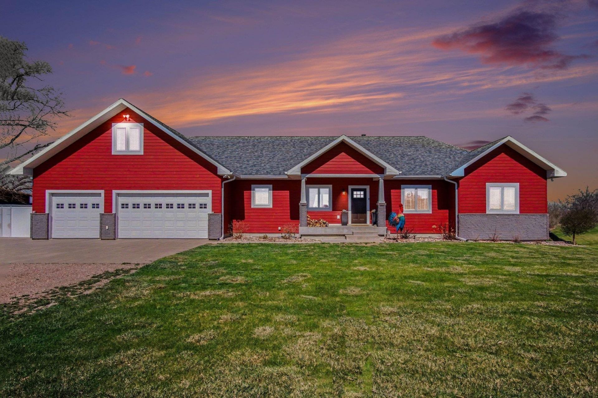 Beautifully crafted raised-ranch home on 4.37 acres, bordered by 256 acres of protected wetlands for exceptional privacy and views. Built in 2014, this property offers 6 bedrooms, 5.5 baths, a finished walk-out basement, and 4,753 sq ft of quality living space. High-speed fiber optic internet and rural water are already in place. The great room features a vaulted ceiling and custom wood-burning fireplace. The kitchen has brand-new quartz countertops, and the updated primary suite includes heated tile floors, a tiled shower with body jets, rain head, and frameless glass door. A basement bathroom also features heated flooring. Craftsman trim, solid doors, 9-ft ceilings, and a whole-home data network enhance the interior. The upper-level bonus room adds flexibility with new wood flooring, a kitchenette, full bath, and its own heating zone. Built with 2x6 exterior walls, spray-foam insulation, and a Lennox 4-zone HVAC system (23 SEER). A full concrete safe-room storm cellar provides peace of mind. Outdoor spaces include a covered front patio and a vaulted, covered rear patio with composite decking overlooking the fully fenced backyard. The newer custom barn offers 16-ft front sliders, dual rear sliders, dual 10-ft garage doors, and a fully insulated shop with concrete floors and tubing in place for future in-floor heat. Fencing and gates are ready for a couple of horses. Two large garden areas support sustainable living. Approximately 11 additional acres to the west are available. A rare opportunity for private, high-quality acreage living.